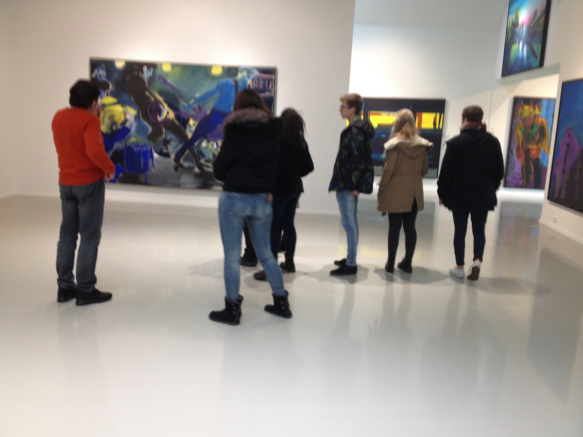 Eine Überraschung der besonderen Art konnten die Schülerinnen und Schüler der Kunst-AG in den letzten Unterrichtsstunden vor den Weihnachtsferien mit ihrer Kunstlehrerin Pia Bausch-Jaaks erleben. Schon beim Eintritt in das 1.000 Quadratmeter große Museum, das zugleich auch Wohnhaus der Familie Zimmer ist, beeindruckte nicht nur die Größe der Museumsräume, sondern auch die gigantisch großen Bildformate der Kunstwerke. Hier sind Kunstwerke von Berliner Künstlern der „Neuen Wilde“ (Hödicke, Salome, Middendorf und vor allem Fetting) zu bestaunen, die der Internist Dr. Zimmer in einem Zeitraum von 40 Jahren gesammelt hat. Die Künstler sind dem Neoexpressionismus zuzurechnen, die die Kunstszene mit greller figurativer Malerei Ende der 80-er Jahre im Sturm eroberte. Hauptmotive sind homoerotische Szenen oder die Großstadt. Neben den zahlreichen Bildern imponierte Fettings Willy-Brandt-Statue den Schülern ganz besonders. Nach einer interessanten Führung durch die Ausstellung von Herrn Dr. Zimmer hatten die Schüler Gelegenheit bei Kaffee, Kuchen und Weihnachtsplätzchen zu einem privaten Gespräch mit dem „Sammler“. Intention der Familie Zimmer ist es, einer breiten Öffentlichkeit das Museum zugänglich zu machen, weshalb die Galerie jeden Sonntag von 14.00 bis 17.00 Uhr ohne vorherige Anmeldung besucht werden kann. Nach Meinung der Schüler ein empfehlenswerter Kulturtipp fürs Wochenende! |