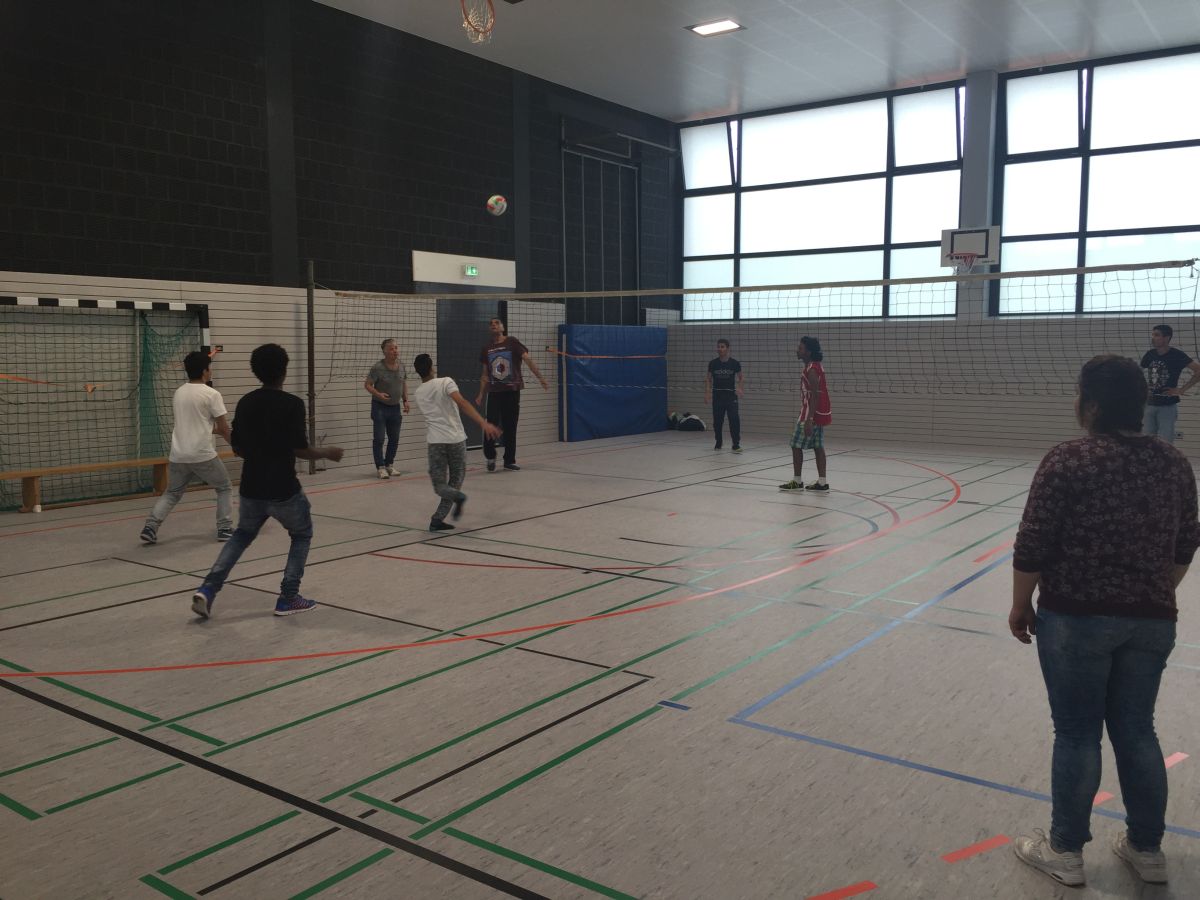 Sport verbindet alle – daher kann besonders der Sportunterricht einen wesentlichen Beitrag zur Integration leisten, auch ohne gemeinsame Sprache: Beim gemeinsamen Sporttreiben werden Hemmschwellen abgebaut, Fairness, Toleranz, Respekt und Teamgeist gefördert. Ein Beispiel dafür stellt ein Projekt im Sportunterricht der Klasse BVJ UMF 4 dar. Die Klasse wurde Anfang Februar 2016 neu gebildet und besteht aus jungen Syrerinnen und Syrern sowie vier Flüchtlingen aus Eritrea. Seit einigen Wochen wird Sportlehrer Helmut Schaub von Freiwilligen Helfern, beide selbst erwachsene Flüchtlinge, aktiv unterstützt. Über das Ehrenamtlichen-Netzwerk der CEB Merzig wurden der Syrer Anas und der Iraker Haider Mitte April 2016 angesprochen und nehmen seither jede Woche am Sportunterricht der Flüchtlingsklasse um Studienrat Schaub teil. Beide sind erfahrene Sporttrainer, die in ihren Herkunftsländern ähnliche Tätigkeiten ausgeübt haben und freuen sich, das BBZ ehrenamtlich bei seiner Bildungsarbeit unterstützen zu können. Im Sportunterricht der Klasse helfen sie Herrn Schaub bei der Vermittlung des Sportlehrplans und überbrücken sprachliche Probleme. "Schulsport bietet auf diese Weise allen Beteiligten eine Plattform des interkulturellen Lernens", resümiert Fachkonferenzleiter Tim Zwick. Er sieht auch im kommenden Schuljahr Einsatzmöglichkeiten für die Freiwilligen und kann sich eine Ausweitung des Projektes vorstellen. |