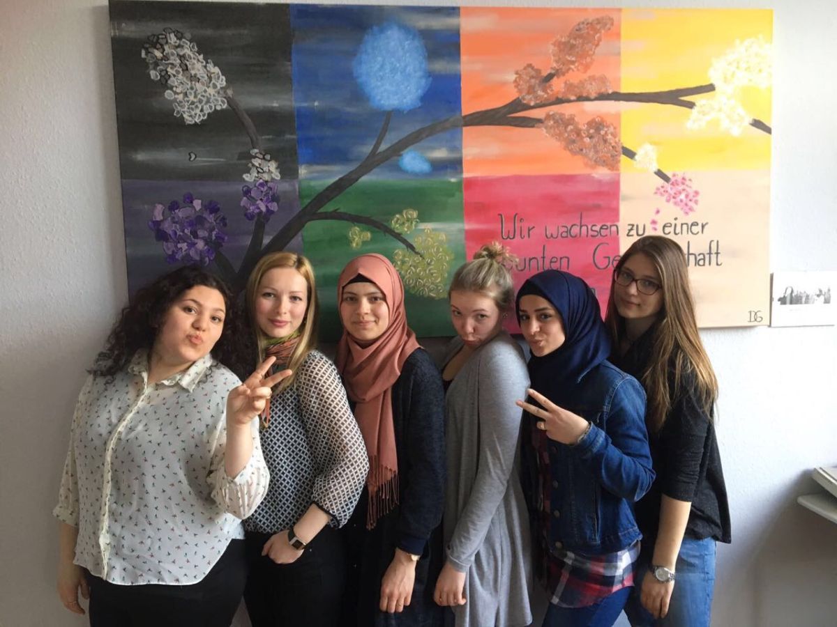 Am 04.04.2017 wurde im Sekretariat Waldstraße ein Bild der fünfköpfigen Kunst-AG um Lehrerin Suzanne Hoffmann enthüllt. Das Bild selbst mit dem Titel „Wir wachsen zu einer bunten Gesellschaft zusammen“ soll ein Zeichen der Integration sein, da die kleine Kunst-AG selbst bunt durchmischt ist: Neben verschiedenen Religionen (Islam und Christentum) haben auch unterschiedliche Nationalitäten zusammengearbeitet (türkisch, syrisch und deutsch). Beteiligt an dem Projekt waren Nour Albaali, Marjana Kassab, Stefanie Summa, Johanna Theobald und Esra Zengin. Jeder war für ein Feld und eine Farbe zuständig; alle Äste und Blüten zusammen ergeben jetzt das Bild. Wir danken der Kunst AG für das Geschenk, das man im Sekretariat gerne bewundern darf. |
