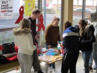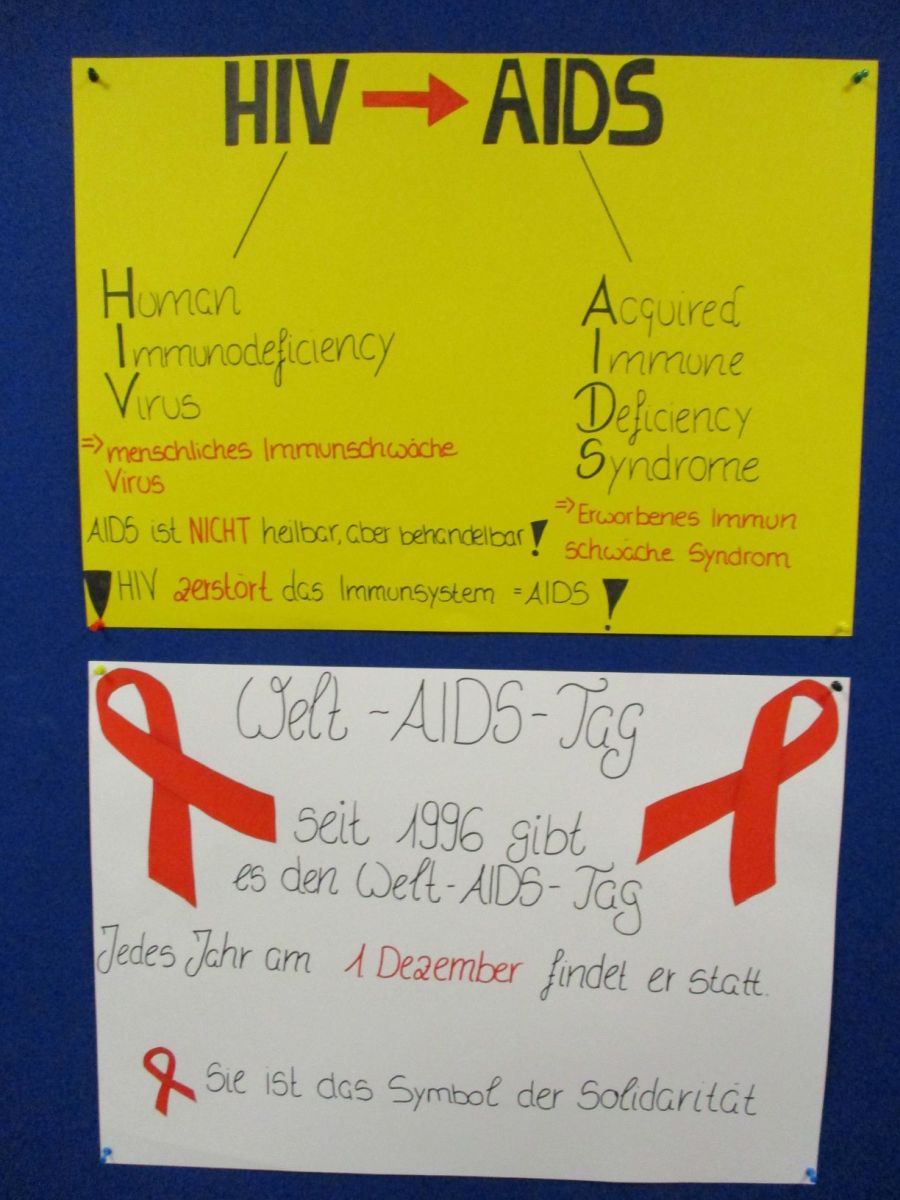 Plakatausstellung zum Welt-AIDS-Tag am Standort Waldstraße Anlässlich des Welt-AIDS-Tages am 01. Dezember findet am BBZ Merzig in der Pausenhalle des Standortes Waldstraße eine Plakatausstellung zum Thema „HIV und Aids“ statt. Schülerinnen und Schüler der HAB-U haben gemeinsam mit ihrer Lehrerin Frau Scherer Plakate erstellt, um ihre Mitschüler auf die tödliche Krankheit aufmerksam zu machen. Neben Begriffserklärungen, Übertragungswegen von HIV und Schutzmaßnahmen widmet sich ein Plakat auch der Frage „Was ist der Welt-AIDS-Tag?“ Er findet in diesem Jahr um 29. Mal statt und wird seit 1988 jährlich am 1. Dezember begangen. Der Welt-AIDS-Tag soll daran zu erinnern, dass das HI-Virus noch längst nicht besiegt ist. Denn weltweit leben etwa 36,7 Millionen Menschen mit HIV. Rund 2,1 Millionen kommen pro Jahr dazu, davon etwa 240.000 Kinder. Auch in Deutschland geht die Zahl der Neuinfektionen trotz intensiver Aufklärung nicht zurück, bleibt aber immerhin konstant. Das BBZ Merzig macht sich seit Jahren für die HIV/Aids-Prävention stark und arbeitet dazu eng mit dem Gesundheitsamt Merzig und der Aids-Hilfe Saar zusammen. So wurden auch in diesem Jahr einige Klassen von Experten besucht, um die Schülerinnen und Schüler über die tödliche Immunschwächekrankheit zu informieren. |